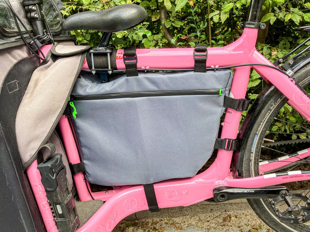 Om het laadvermogen van de Bullitt te optimaliseren maakte ik een frametas. Het frame van de Bullitt is eerder vierkant, de meeste andere fietsen voor bikepacking hebben eerder een driehoekig frame, een vierkante frametas op maat van het Bullitframe is niet te koop.