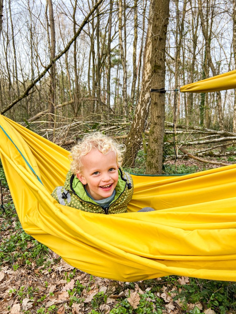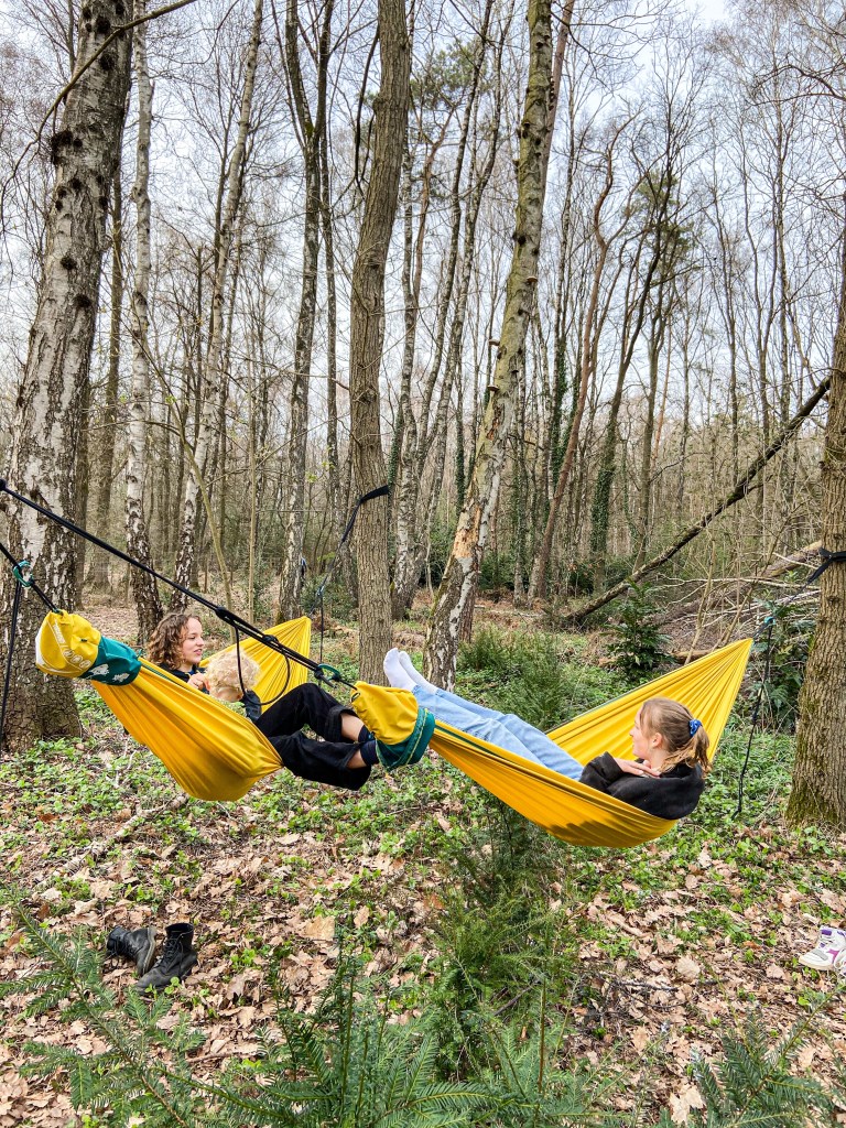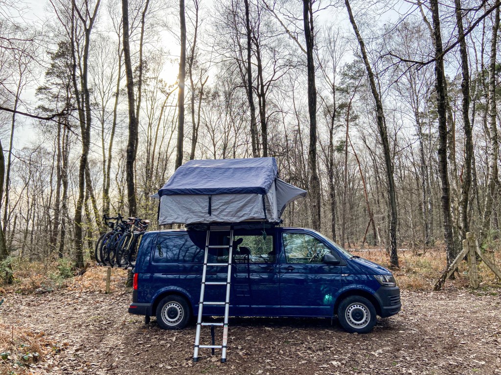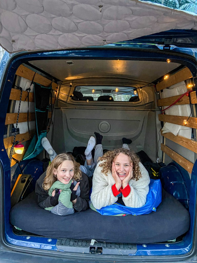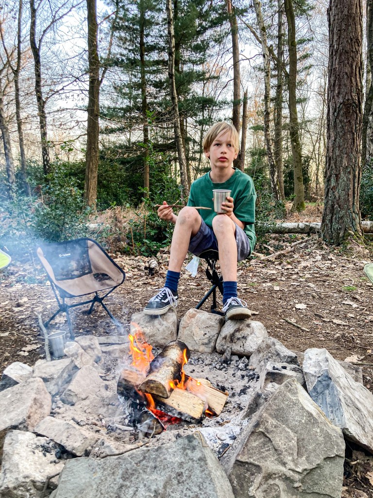 De frituur was op fietsafstand en het kampvuur gaf snel warmte! Het was best fris! We gingen vroeg slapen, spannend! De meisjes sliepen in de laadruimte, de jongens en Dries en ik in de daktent. Lekker dicht bij elkaar. Tot vader net iets te luid snurkte en verbannen werd naar de hangmat.