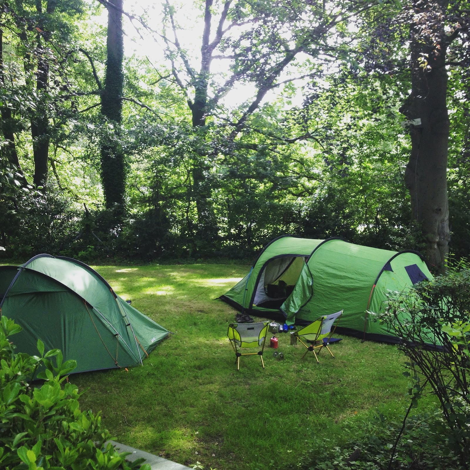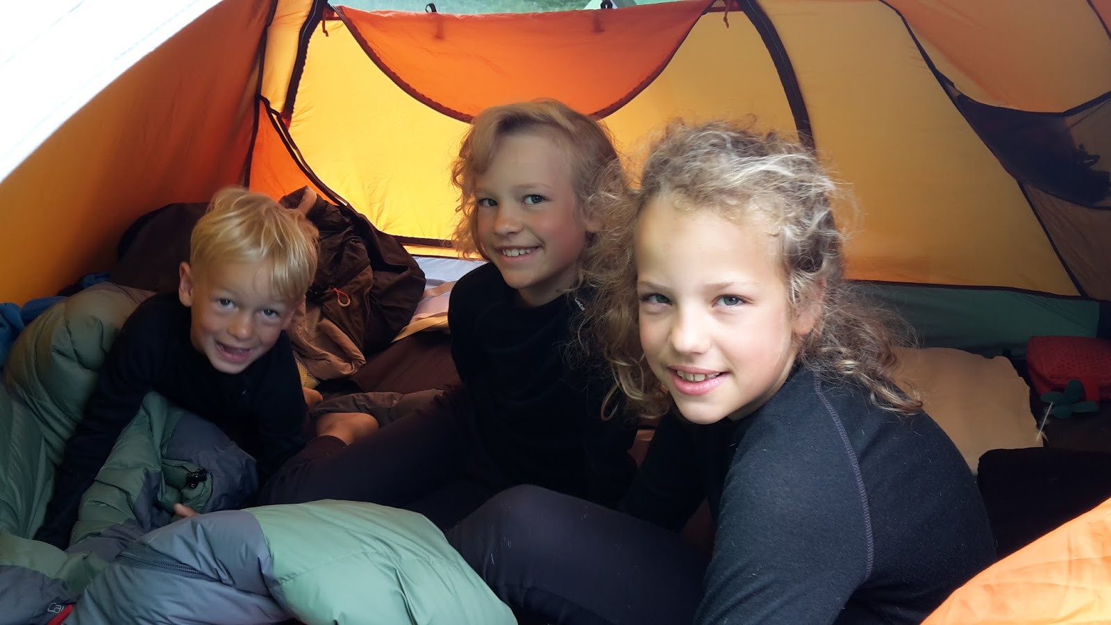 We kozen voor twee aparte tenten om verschillende redenen. De meisjes willen graag hun eigen tent en een tent voor vijf personen is moeilijk te vinden, tenminste als je twee compartimenten wilt. De Carl Denig (6kg) heeft een grote voortent waar we met regen makkelijk allemaal in passen als we de kidsroom en de bagage in het grote slaapcompartiment gooien (dat is tot nu toe nog nooit gebeurd). De kidsroom geeft plaats aan een kleintje, er kan geen volwassene in slapen. Astor vonden we nog wat jong om al zo ver van ons te slapen maar tijdens de zomerfietsvakantie wilde hij absoluut bij zijn zussen slapen. Daarom kochten we ook de Halo 300 (4kg), voor 3 personen dus. Ook kunnen wij er met ons twee wel eens mee op pad en hebben we ruimte genoeg in de Vango. Beide tenten hebben een doek met een hoge waterbestendigheid. Ze zijn allebei hoog genoeg om comfortabel in te zitten en je om te kleden. Iets wat met een slechte rug toch belangrijk is. De Vango is naar ons gevoel beter van kwaliteit dan de Carl Denig. Er is minder condens (maar dat ligt vast aan het vaste ingenaaide grondzeil van de Carl Denig) en de ogen om de stokken in te steken zijn sterker. Ook is de Carl Denig minder comfortabel in verluchting, minder gaas, lastiger open te ritsen. Maar dat zijn details want beide tenten zijn top in prijs – kwaliteit – gewicht – opzetgemak. - Slaapzakken: Robens Caucasus 300 en Nomad Triple S junior voor Astor omdat hij nog maar net droog is ’s nachts en synthetisch toch makkelijker gewassen kan worden op de camping.
