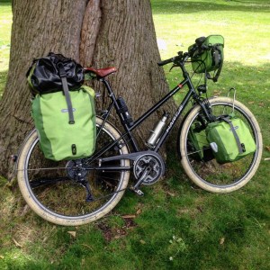 - Ortliebtassen: 5 paar backrollers, 2 paar frontrollers, 1 Rackpack en 2 stuurtassen. De tenten, Astors slaapzak en het picknickdekentje werden onder de snelbinder vervoerd. Dat maakt een hele berg bagage bij het af- en opladen voor de trein bijvoorbeeld.